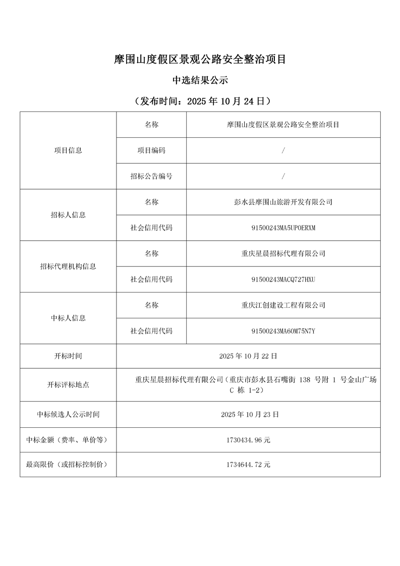摩圍山度假區(qū)景觀公路安全整治項目中選結果公示
