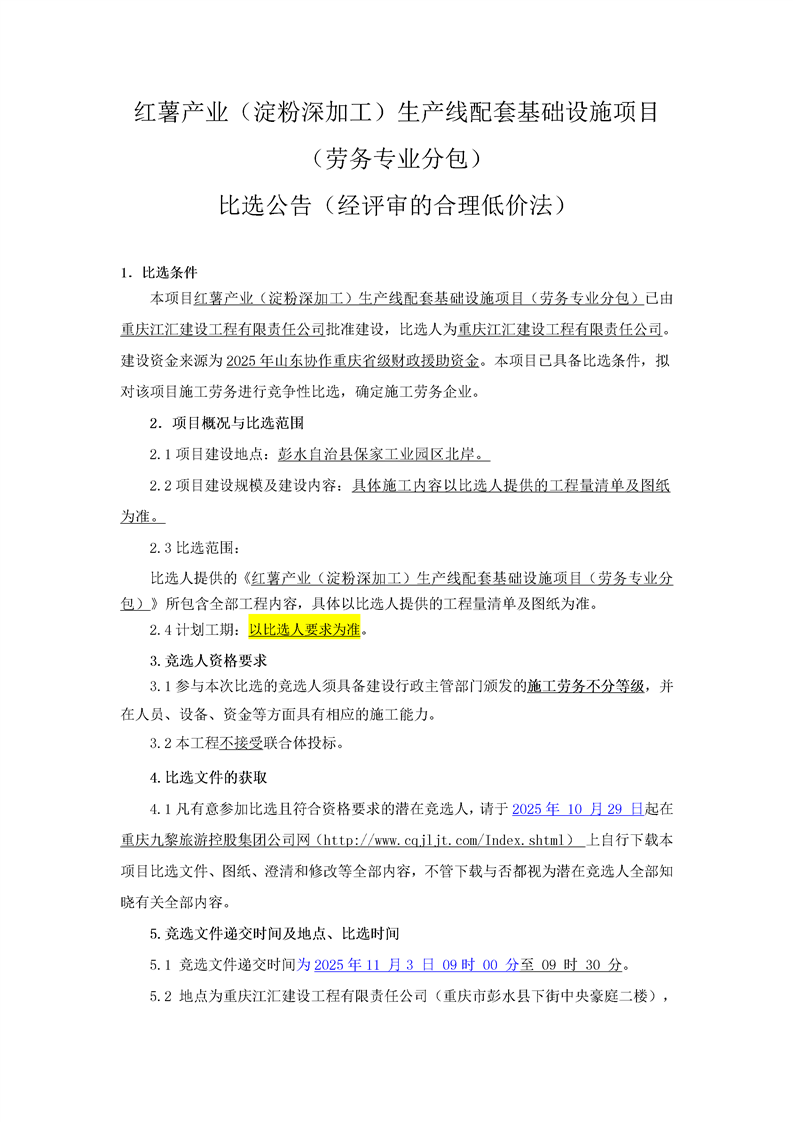 紅薯產(chǎn)業(yè)(淀粉深加工)生產(chǎn)線配套基礎(chǔ)設(shè)施項目 (勞務專業(yè)分包) 比選公告(經(jīng)評審的合理低價法)