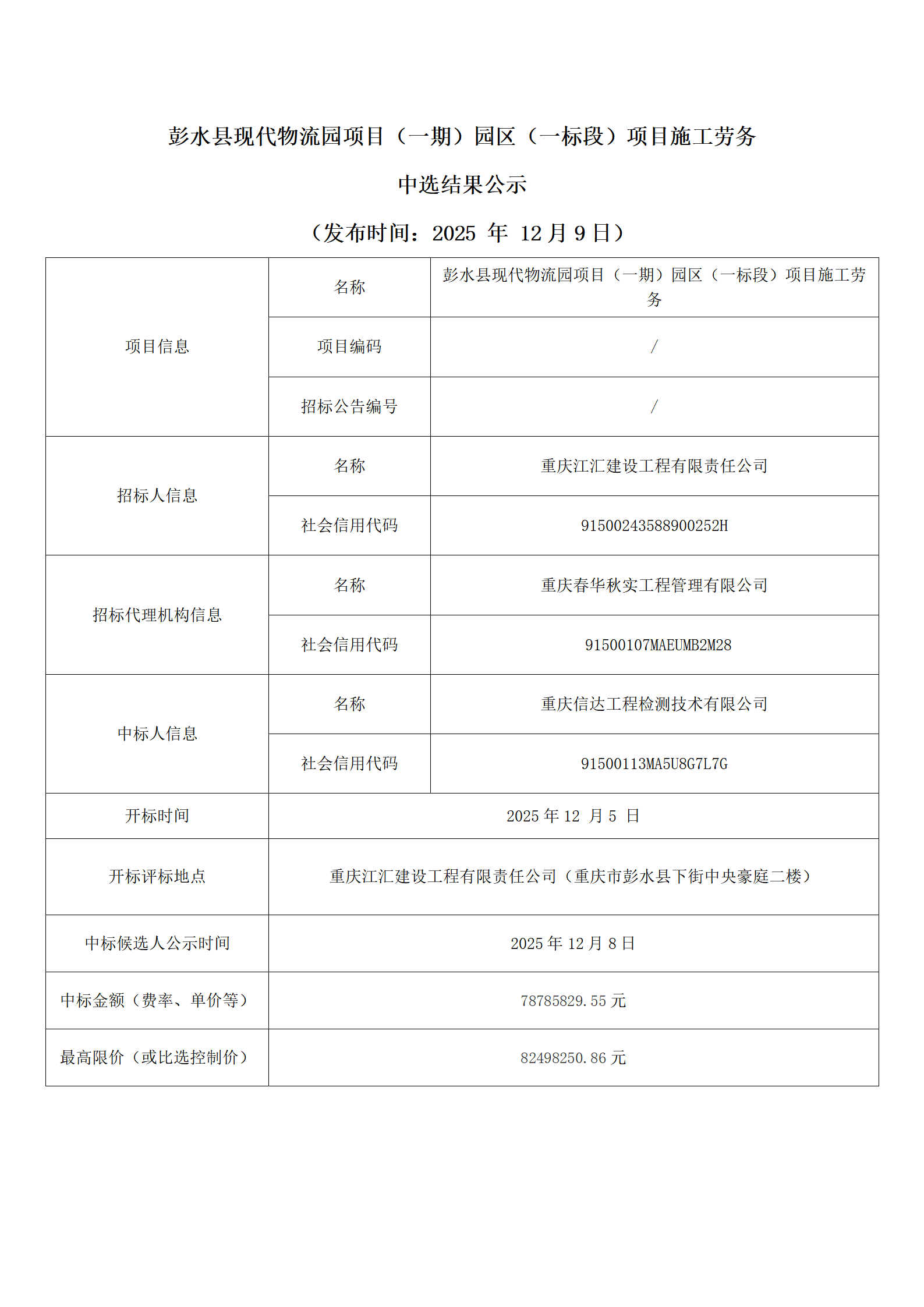 彭水縣現(xiàn)代物流園項目(一期)園區(qū)(一標段)項目施工勞務中選結果公示