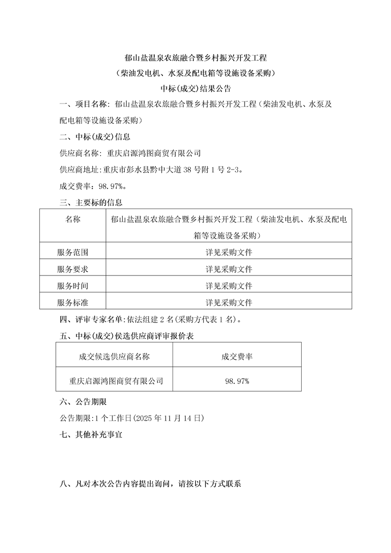郁山鹽溫泉農(nóng)旅融合暨鄉(xiāng)村振興開發(fā)工程(柴油發(fā)電機(jī)、水泵及配電箱等設(shè)施設(shè)備采購(gòu))中標(biāo)(成交)結(jié)果公告
