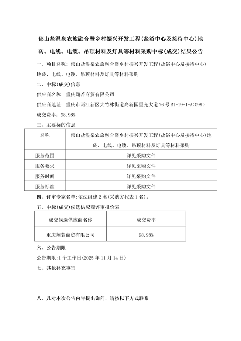 郁山鹽溫泉農(nóng)旅融合暨鄉(xiāng)村振興開發(fā)工程(鹽浴中心及接待中心)地磚、電線、電纜、吊頂材料及燈具等材料采購(gòu)中標(biāo)(成交)結(jié)果公告