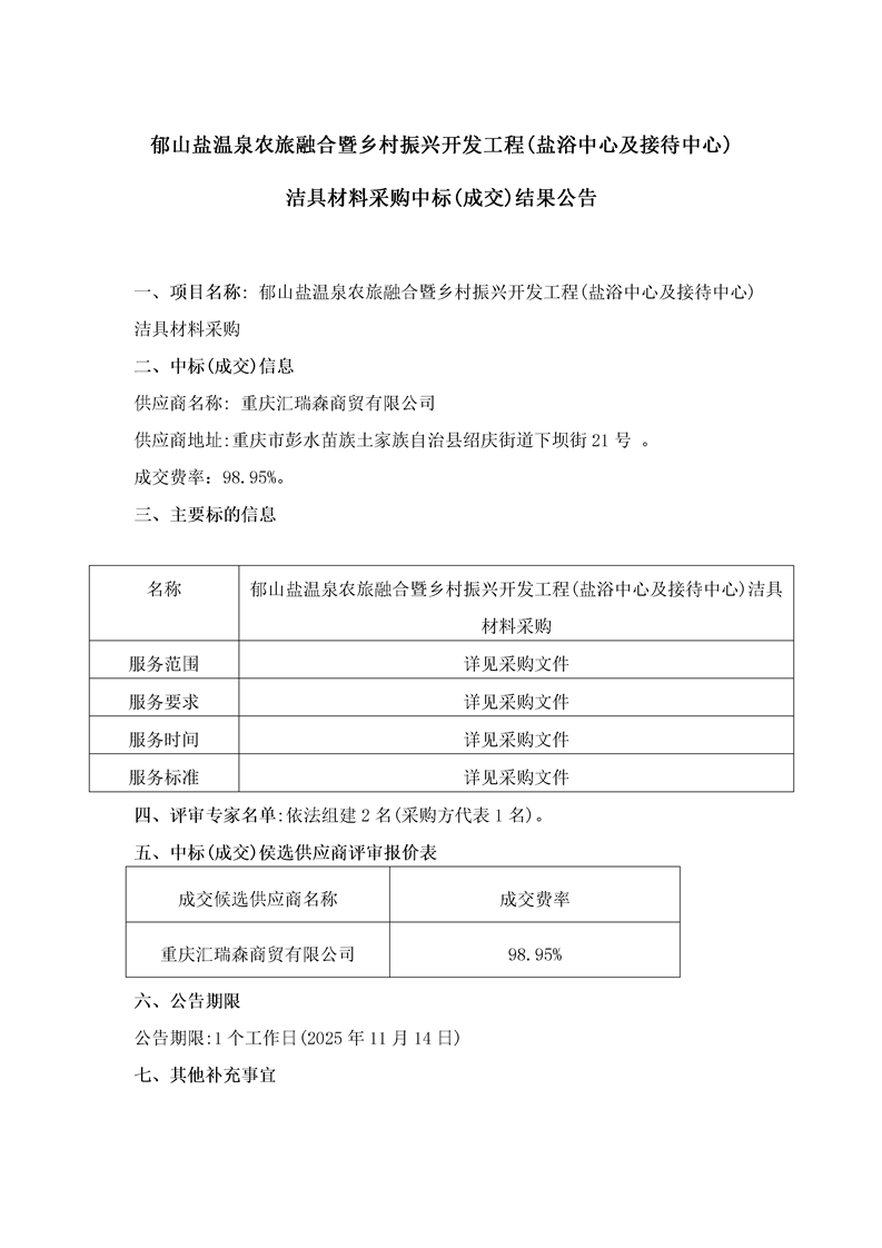 郁山鹽溫泉農(nóng)旅融合暨鄉(xiāng)村振興開發(fā)工程(鹽浴中心及接待中心) 潔具材料采購中標(biāo)(成交)結(jié)果公告