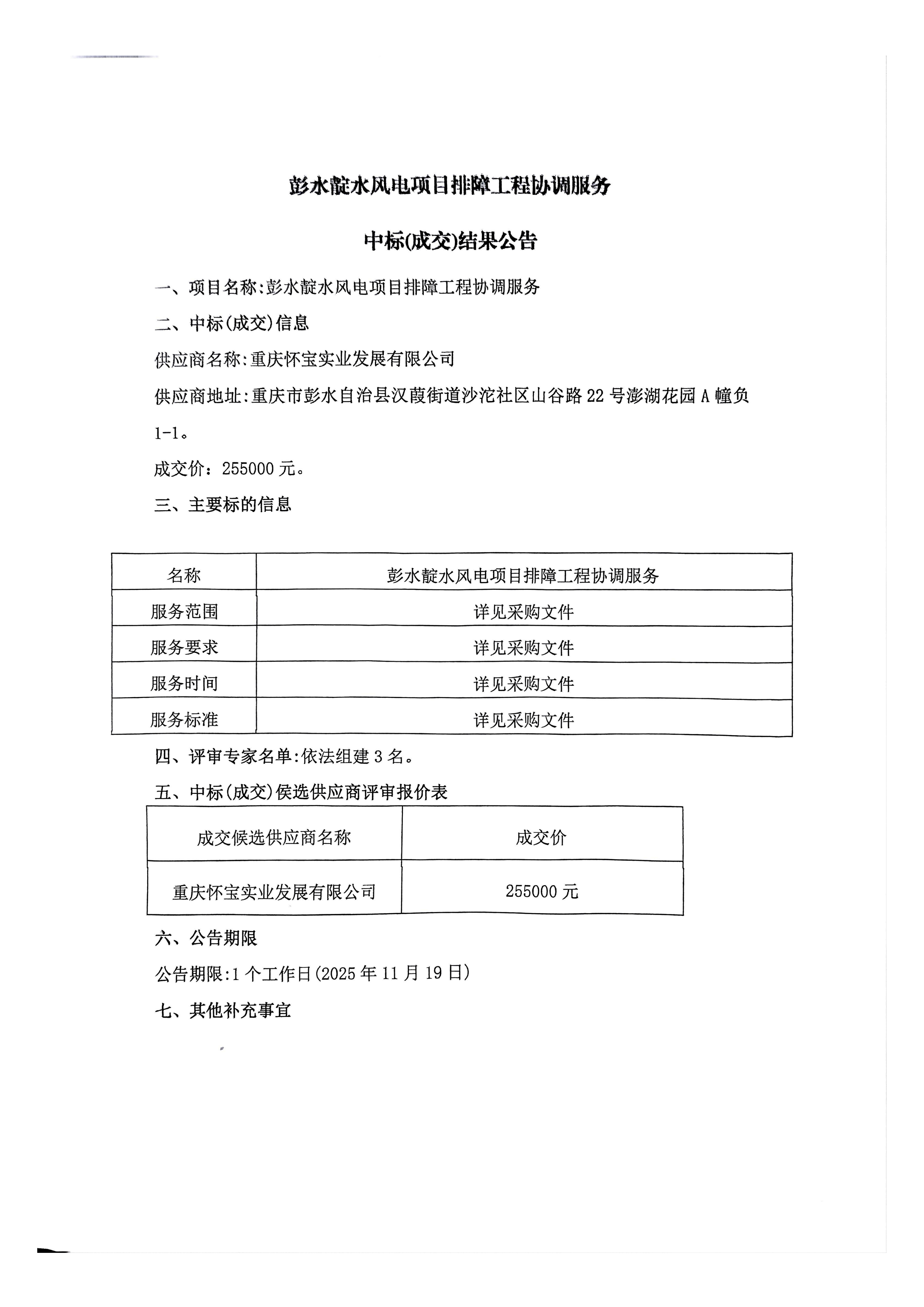 彭水靛水風(fēng)電項(xiàng)目排障工程協(xié)調(diào)服務(wù)中標(biāo)(成交)結(jié)果公告