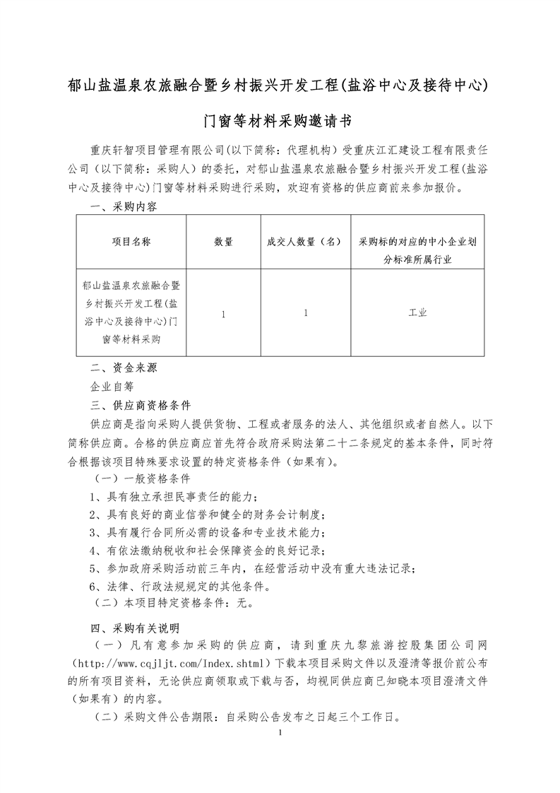 郁山鹽溫泉農(nóng)旅融合暨鄉(xiāng)村振興開發(fā)工程(鹽浴中心及接待中心)門窗等材料采購邀請書